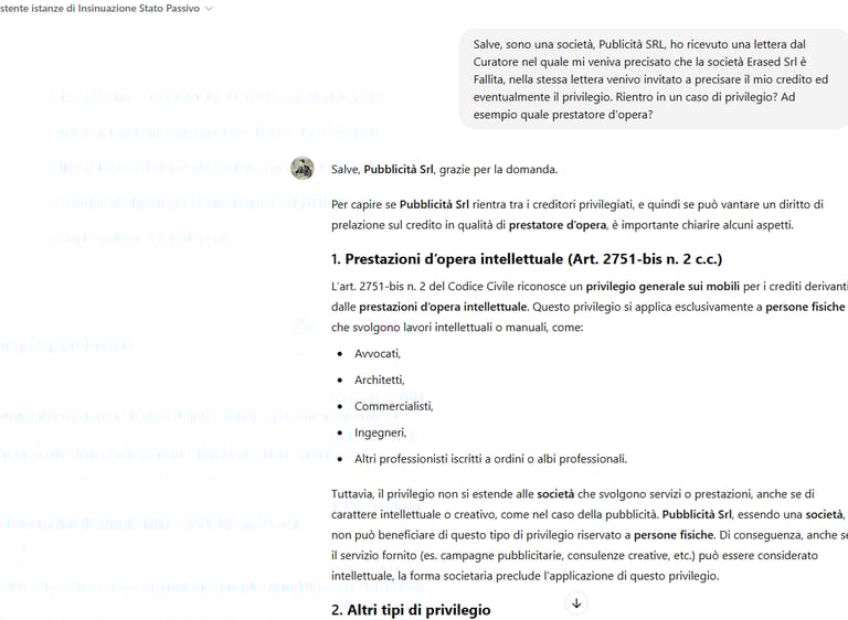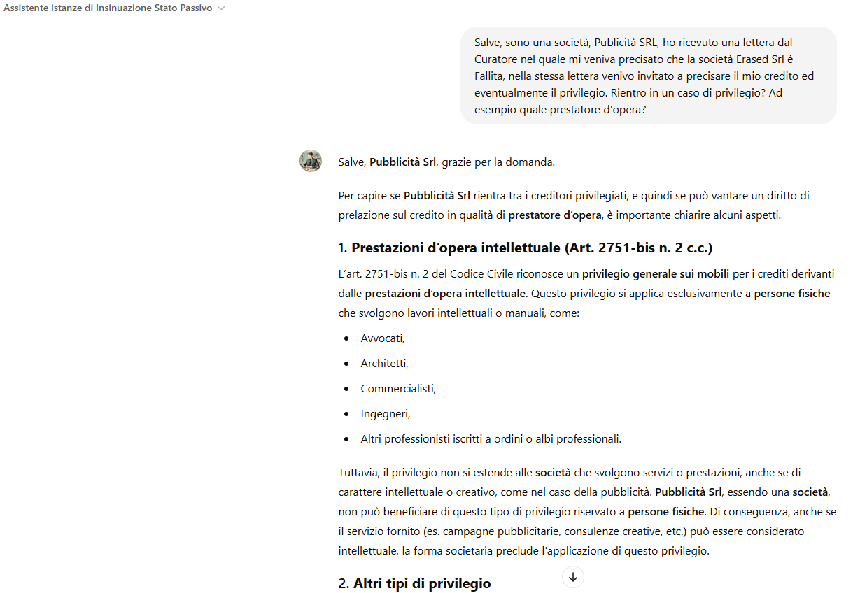 La redazione di una domanda di insinuazione al passivo richiede attenzione a numerosi dettagli: dal contesto di eventuali procedure precedenti, dalla corretta identificazione dei privilegi alla completezza della documentazione, dalla precisione dei riferimenti normativi alla chiarezza espositiva. In questo contesto, l'intelligenza artificiale può offrire un supporto significativo, aiutando i professionisti a gestire questi aspetti in modo più efficiente. L'Assistente per la redazione di insinuazioni al passivo nasce per supportare il professionista nella preparazione e verifica delle domande di insinuazione. Non si tratta di delegare la responsabilità professionale - chi ha presentato anche una sola insinuazione sa bene quanto sia cruciale l'expertise e il giudizio umano nel caso concreto - ma di utilizzare la tecnologia per ridurre il rischio di errori e dimenticanze, nonché di lasciare maggior tempo al professionista per dedicarsi alla valutazione e al controllo della pratica.
