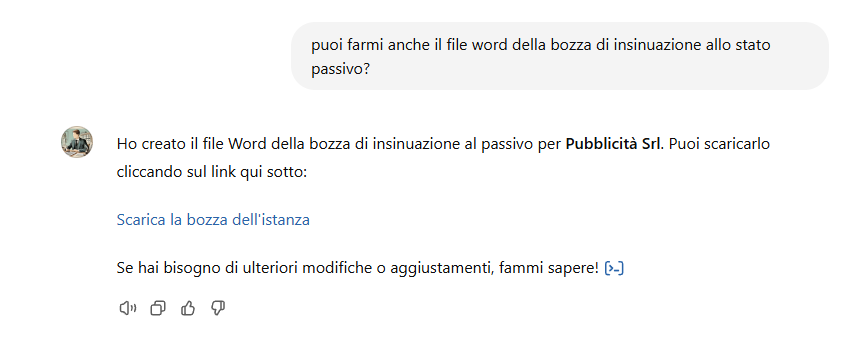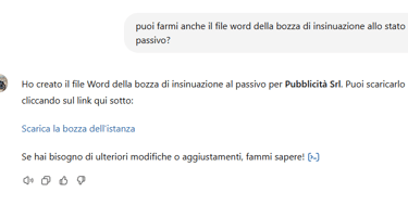 Infine, ricordati che potrai chiedere direttamente al Gpt'suna bozza in formato word, nei pulsanti in calce alla pagina troverai la conversazione completa