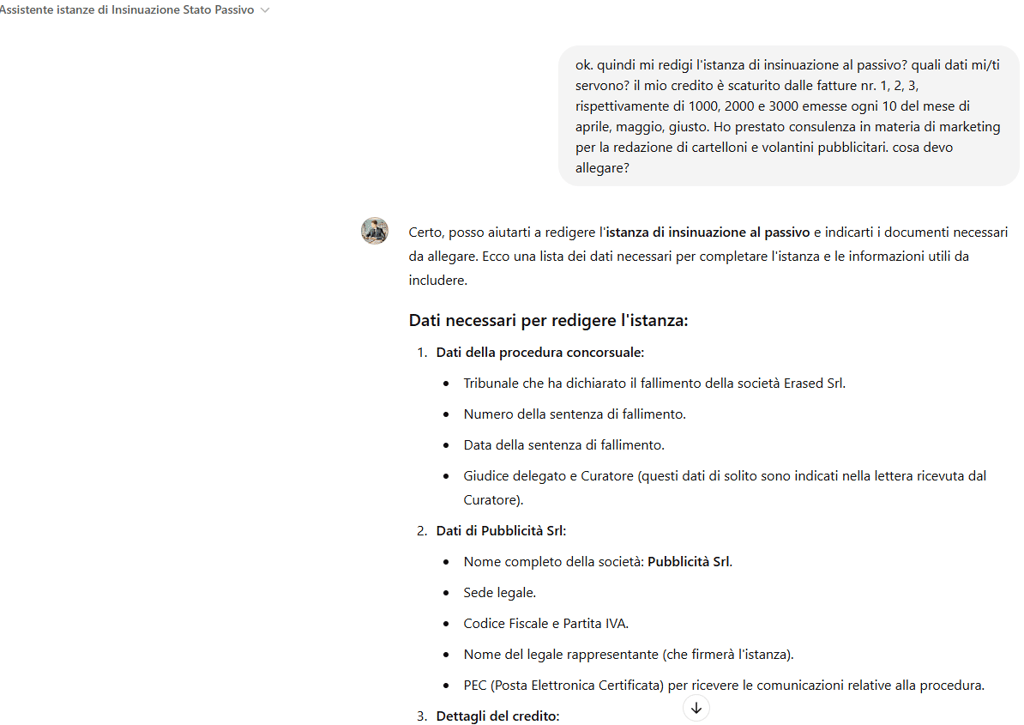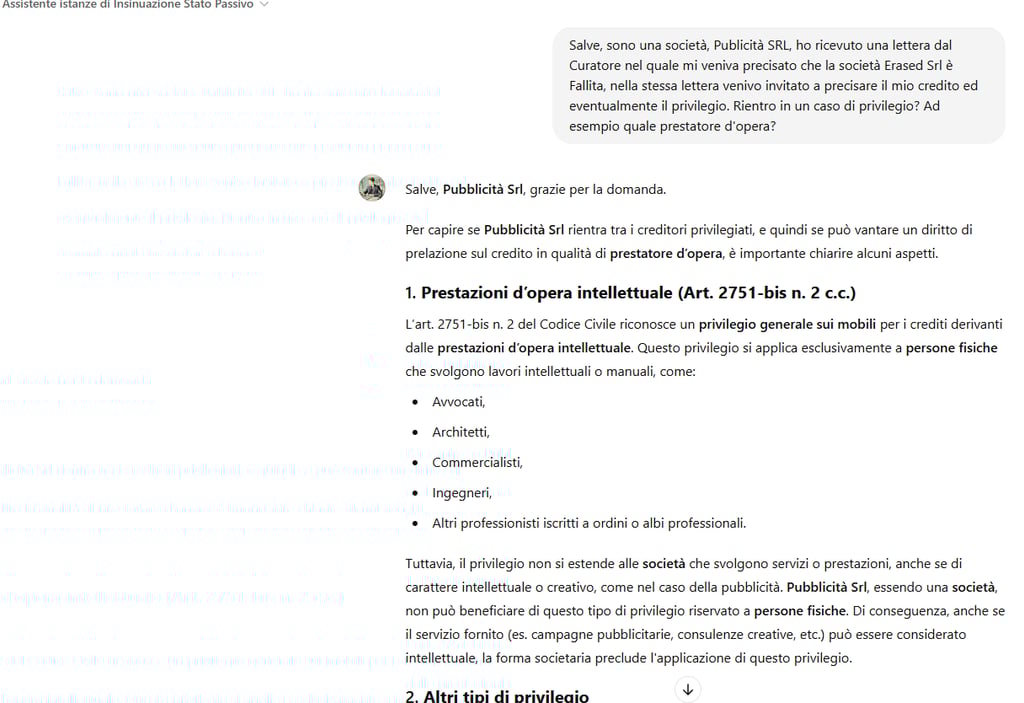 La redazione di una domanda di insinuazione al passivo richiede attenzione a numerosi dettagli: dal contesto di eventuali procedure precedenti, dalla corretta identificazione dei privilegi alla completezza della documentazione, dalla precisione dei riferimenti normativi alla chiarezza espositiva. In questo contesto, l'intelligenza artificiale può offrire un supporto significativo, aiutando i professionisti a gestire questi aspetti in modo più efficiente. L'Assistente per la redazione di insinuazioni al passivo nasce per supportare il professionista nella preparazione e verifica delle domande di insinuazione. Non si tratta di delegare la responsabilità professionale - chi ha presentato anche una sola insinuazione sa bene quanto sia cruciale l'expertise e il giudizio umano nel caso concreto - ma di utilizzare la tecnologia per ridurre il rischio di errori e dimenticanze, nonché di lasciare maggior tempo al professionista per dedicarsi alla valutazione e al controllo della pratica.