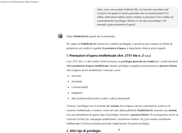 L'analisi inizia con l'inquadramento giuridico del credito. Come evidenziato nell'esempio che si riporta di seguito, l'assistente valuta la sussistenza di eventuali cause di prelazione, analizzando le specifiche caratteristiche del creditore e la natura del credito alla luce della normativa vigente. Nel caso di una società di servizi pubblicitari, ad esempio, l'assistente chiarisce l'impossibilità di invocare il privilegio ex art. 2751-bis n.2 c.c., fornendo il necessario supporto normativo.