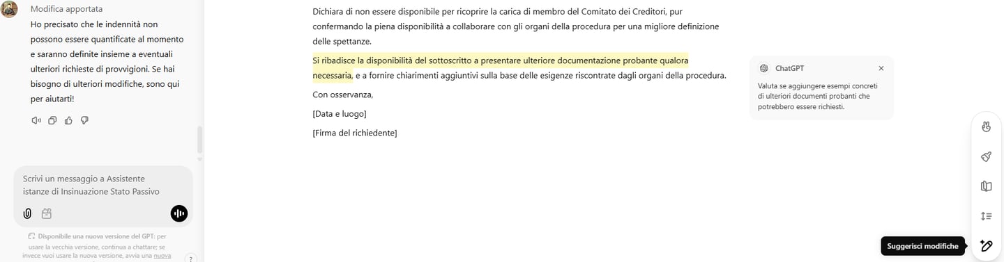 Integrazione con i nostri GPT's: Canvas si integra perfettamente con l'Assistente Insinuazione al Passivo. Esempio pratico: