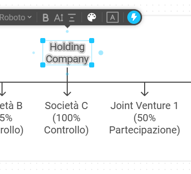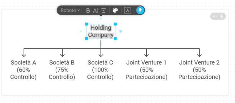 La vera innovazione sta nella semplicità d'uso. Per creare un diagramma, è sufficiente selezionare il testo che descrive la struttura desiderata. Ad esempio, selezionando la descrizione "una holding al vertice con tre società operative controllate al 60%, 75% e 100%, includendo due joint venture partecipate al 50%", Napkin AI la tradurrà in un diagramma professionale. Una volta generato il grafico, è possibile modificare ogni singolo elemento cliccandoci sopra, personalizzando colori, forme, connessioni e testi per ottenere esattamente la visualizzazione desiderata.